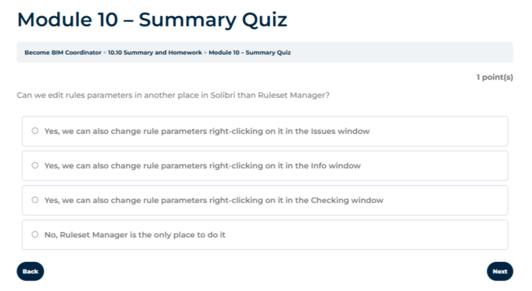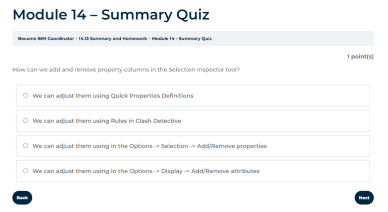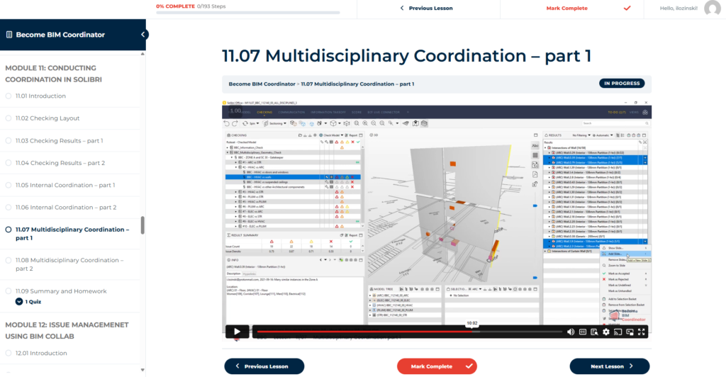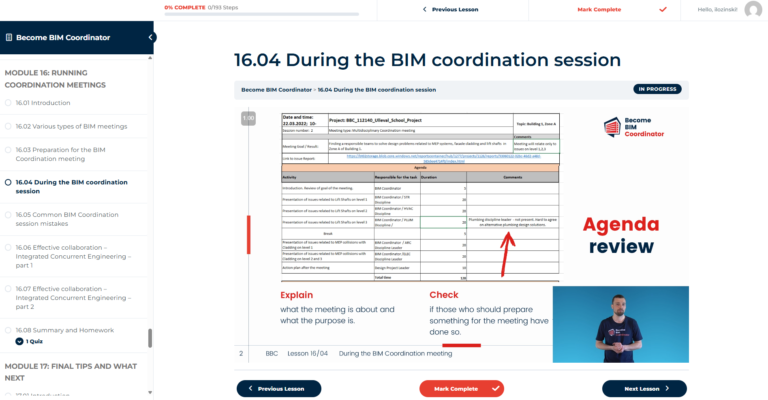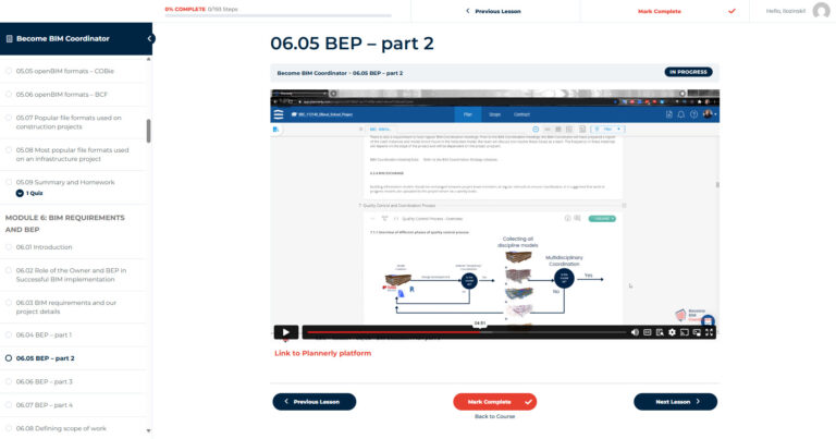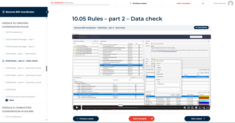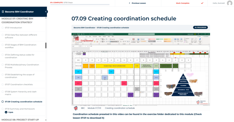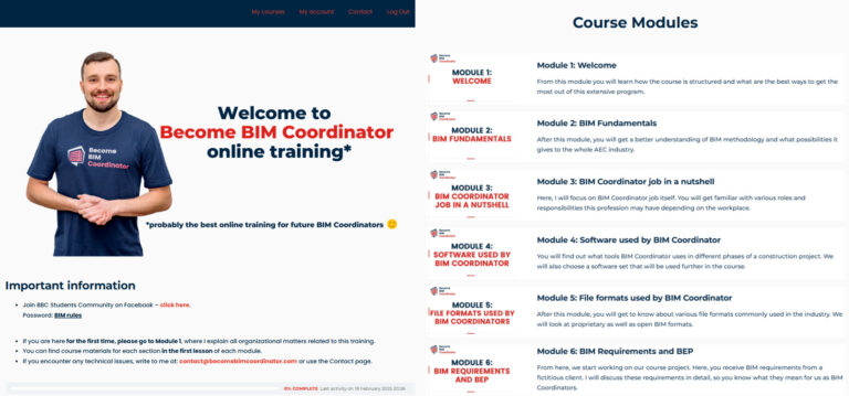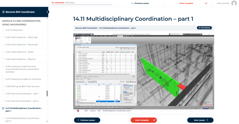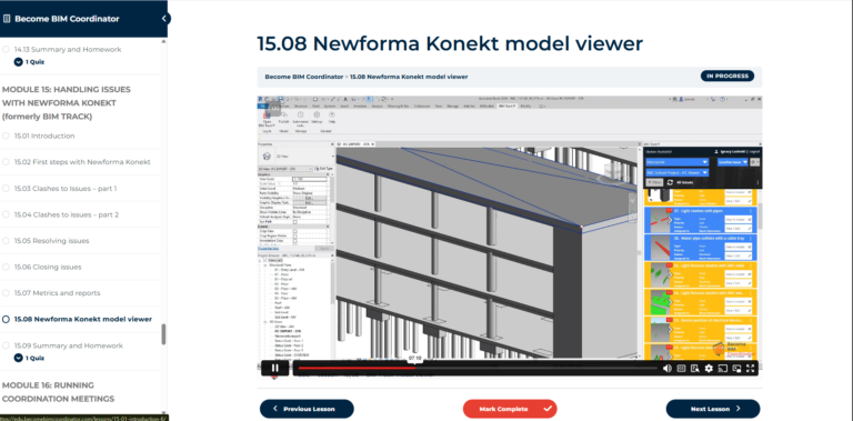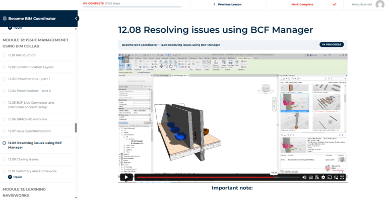 Become BIM Coordinator is a comprehensive, self-paced training program containing 17 modules with over 180 practical video lessons (40+ hours of content), hosted on our dedicated learning platform.